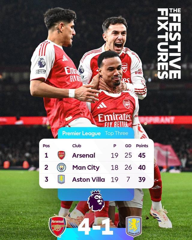 在此役4-1大胜维拉之后,阿森纳以45分位居英超积分榜首位,领先身后的曼城5分,领先维拉6分。